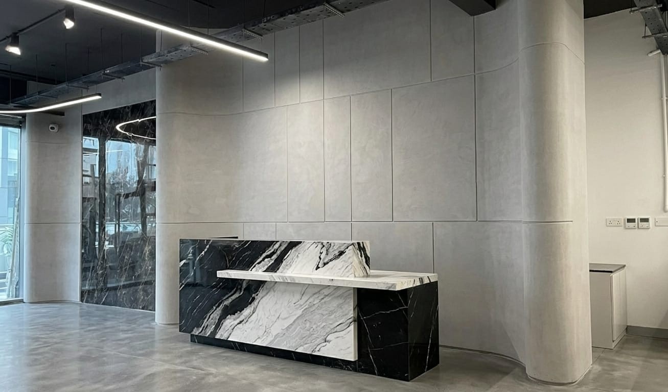 Microcement is a high-end decorative coating that creates a seamless, modern surface without joints. It is applied in thin layers over existing materials like concrete, tiles, plaster, or drywall—giving spaces a refined, continuous finish.